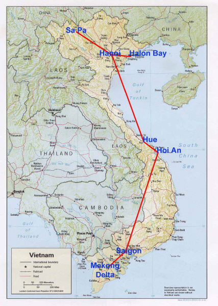 Von Bremen via Paris nach Hanoi. Zurück ging es dann von Saigon. Wir hatten nur die Flüge gekauft. Alles andere haben wir vor Ort organisiert. Alles kein Problem dank der freundlichen und hilfsbereiten Vietnamesen und dem Reise Know-How. Das Internet war natürlich auch ein riesiger Ratgeber, eine sehr gute Seite: Vietnam-Freunde. Unsere Reiseroute - siehe Karte